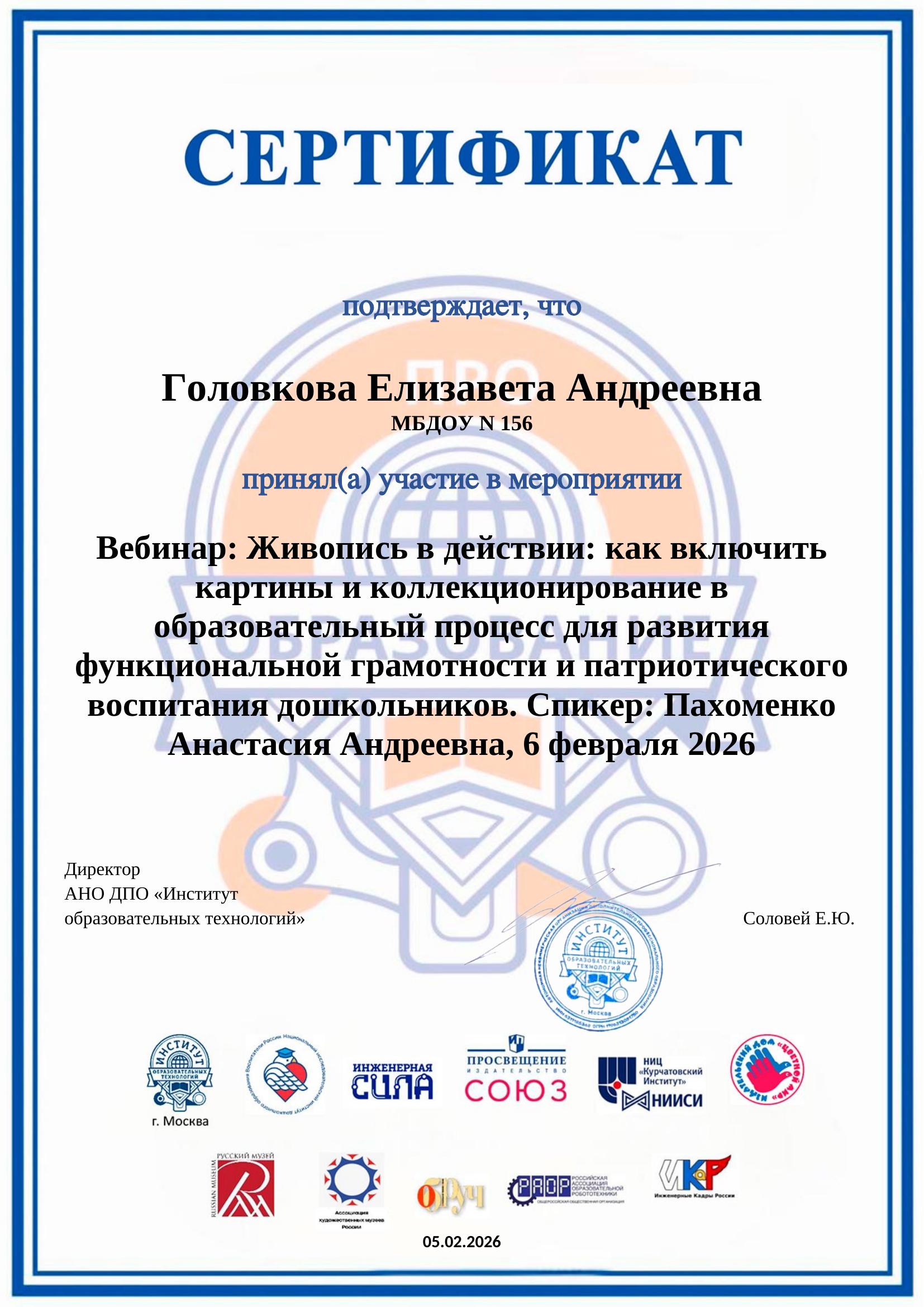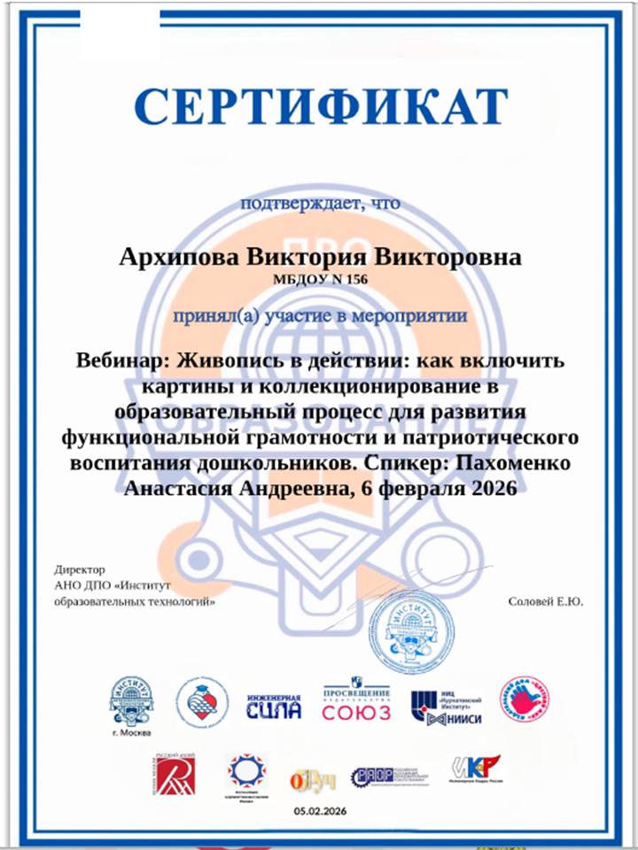 На основании Положения об инновационной площадке федерального уровня АНО ДПО "НИИ дошкольного образования "Воспитатели России", Соглашения о сотрудничестве между АНО ДПО "НИИ дошкольного образования "Воспитатели России" и АНО ДПО "Институт образовательных технологий" от 12.01.2023 МБДОУ № 156 присвоен статус "Сетевой инновационной площадки АНО ДПО "НИИ дошкольного образования "Воспитатели России" по теме "Картинная галерея в детском саду".